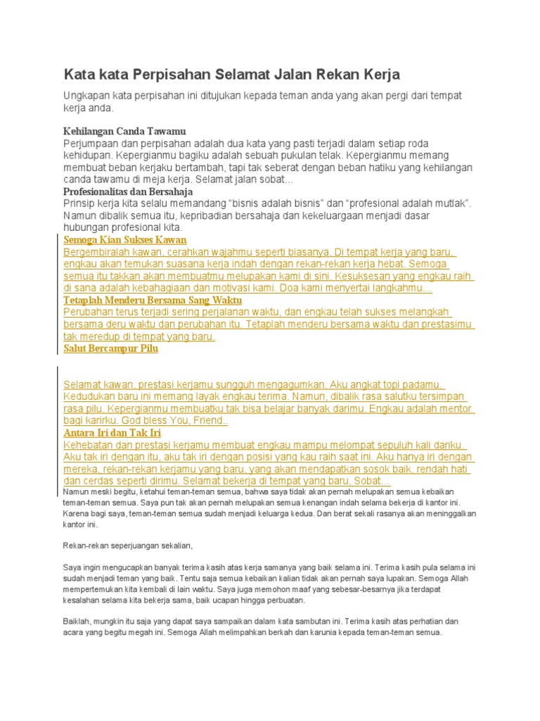 15 Kata-Kata Perpisahan untuk Rekan Kerja dan Atasan | PosBagus Kata-kata perpisahan untuk rekan kerja tersebut sangat ampuh meredam kesedihan dan membangkitkan semangat pertemanan. 4. Menderu Bersama Waktu Perubahan terus terjadi seiring perjalanan waktu, dan engkau telah berhasil melangkah bersama deru waktu serta perubahan itu. Tetaplah menderu bersama waktu agar prestasimu tak meredup di tempat yang baru.